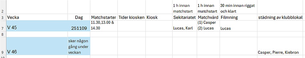 Bifogar bild ovan på de som är schemalagda med arbetspass. (tog även med storstädningen av klubblokal som vi ansvarar för nästa vecka)