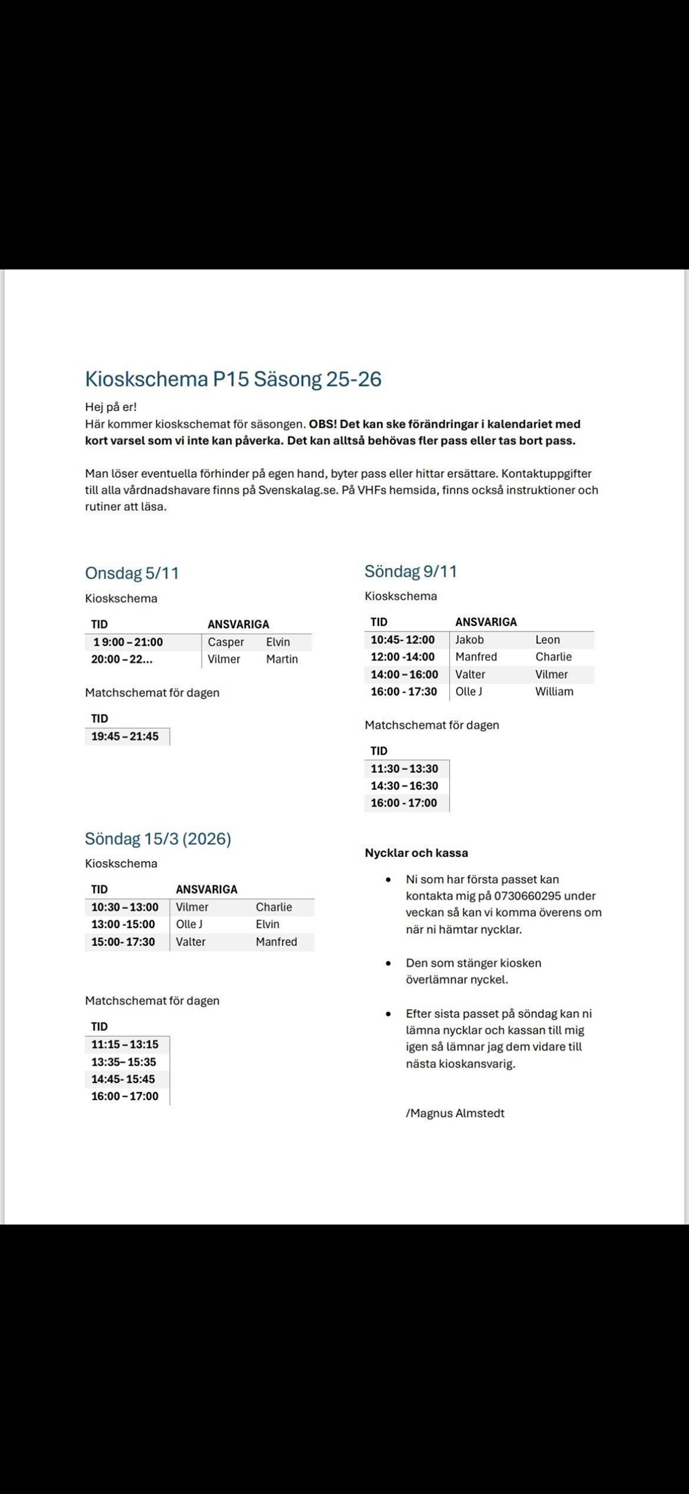 Hej 👋🏻 Jag är med som extrahjälp/tränare den här säsongen (det togs upp på föräldramötet) och såg nu att vi även står uppsatta på kioskpass. Tänkte bara nämna det – om det går att justera vore det toppen. Tack för allt jobb med schemat.